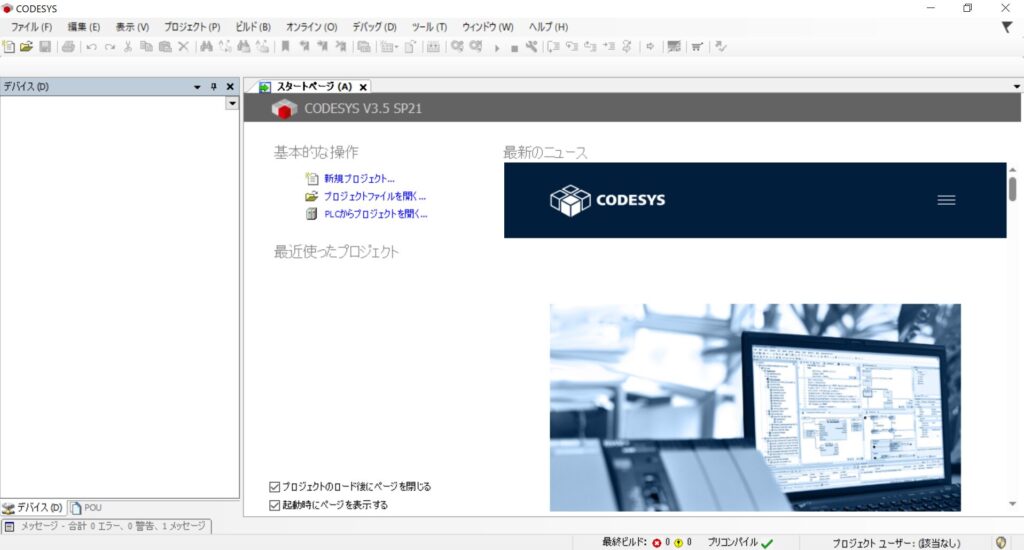 • インストール後、スタートメニューまたはデスクトップから「CODESYS」を起動します